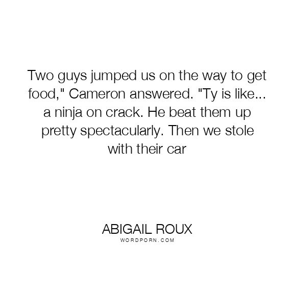 Two guys jumped us on the way to get food," Cameron answered. "Ty is like... a ninja on crack. He beat them up pretty spectacularly. Then we stole with their car