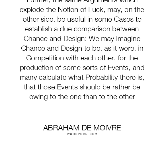 Further, the same Arguments which explode the Notion of Luck, may, on the other side, be useful in some Cases to establish a due comparison between Chance and Design: We may imagine Chance and Design to be, as it were, in Competition with each other, for the production of some sorts of Events, and many calculate what Probability there is, that those Events should be rather be owing to the one than to the other