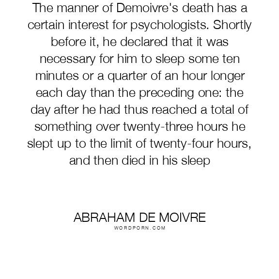 The manner of Demoivre's death has a certain interest for psychologists. Shortly before it, he declared that it was necessary for him to sleep some ten minutes or a quarter of an hour longer each day than the preceding one: the day after he had thus reached a total of something over twenty-three hours he slept up to the limit of twenty-four hours, and then died in his sleep