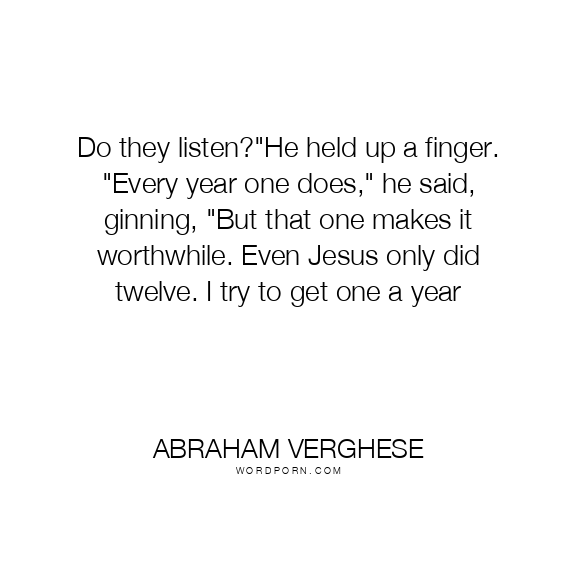 Do they listen?"He held up a finger. "Every year one does," he said, ginning, "But that one makes it worthwhile. Even Jesus only did twelve. I try to get one a year