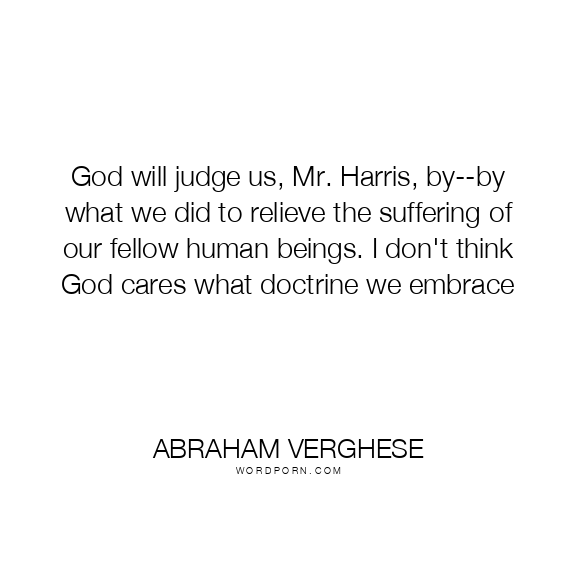Abraham Verghese quote. God will judge us, Mr. Harris, by--by what we did to relieve the suffering of our fellow human beings. I don't think God cares what doctrine we embrace