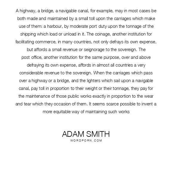 A highway, a bridge, a navigable canal, for example, may in most cases be both made and maintained by a small toll upon the carriages which make use of them: a harbour, by moderate port-duty upon the tonnage of the shipping which load or unload in it. The coinage, another institution for facilitating commerce, in many countries, not only defrays its own expense, but affords a small revenue or seignorage to the sovereign. The post-office, another institution for the same purpose, over and above defraying its own expense, affords in almost all countries a very considerable revenue to the sovereign. When the carriages which pass over a highway or a bridge, and the lighters which sail upon a navigable canal, pay toll in proportion to their weight or their tonnage, they pay for the maintenance of those public works exactly in proportion to the wear and tear which they occasion of them. It seems scarce possible to invent a more equitable way of maintaining such works