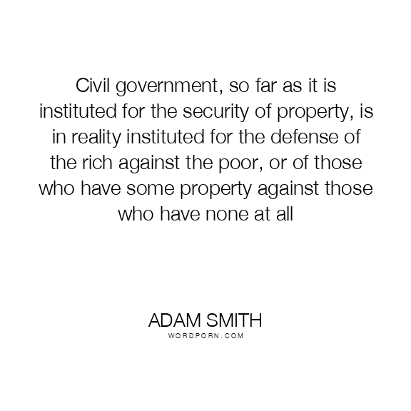 Civil government, so far as it is instituted for the security of property, is in reality instituted for the defense of the rich against the poor, or of those who have some property against those who have none at all