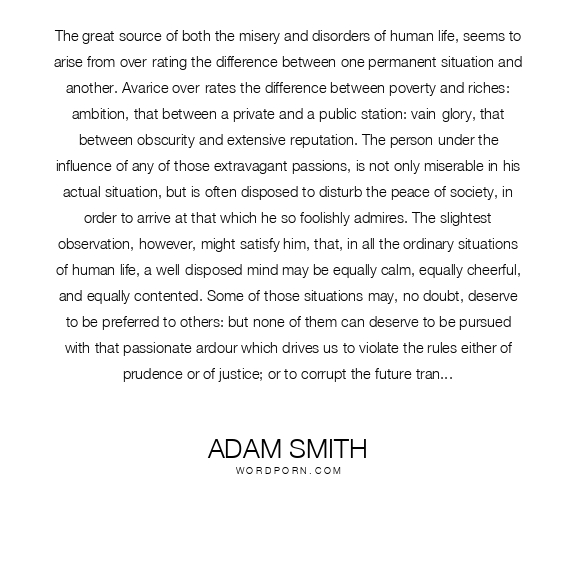 The great source of both the misery and disorders of human life, seems to arise from over-rating the difference between one permanent situation and another. Avarice over-rates the difference between poverty and riches: ambition, that between a private and a public station: vain-glory, that between obscurity and extensive reputation. The person under the influence of any of those extravagant passions, is not only miserable in his actual situation, but is often disposed to disturb the peace of society, in order to arrive at that which he so foolishly admires. The slightest observation, however, might satisfy him, that, in all the ordinary situations of human life, a well-disposed mind may be equally calm, equally cheerful, and equally contented. Some of those situations may, no doubt, deserve to be preferred to others: but none of them can deserve to be pursued with that passionate ardour which drives us to violate the rules either of prudence or of justice; or to corrupt the future tranquillity of our minds, either by shame from the remembrance of our own folly, or by remorse from the horror of our own injustice