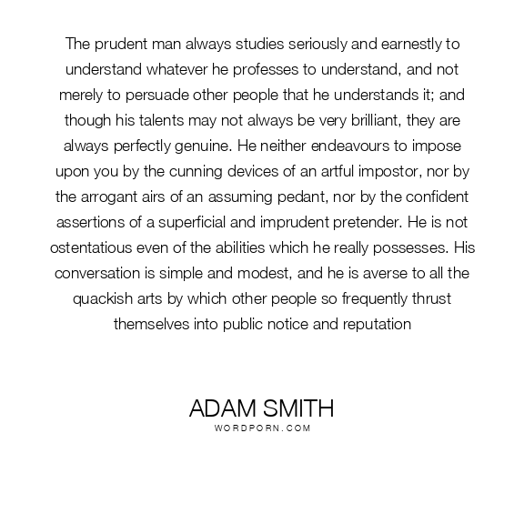 The prudent man always studies seriously and earnestly to understand whatever he professes to understand, and not merely to persuade other people that he understands it; and though his talents may not always be very brilliant, they are always perfectly genuine. He neither endeavours to impose upon you by the cunning devices of an artful impostor, nor by the arrogant airs of an assuming pedant, nor by the confident assertions of a superficial and imprudent pretender. He is not ostentatious even of the abilities which he really possesses. His conversation is simple and modest, and he is averse to all the quackish arts by which other people so frequently thrust themselves into public notice and reputation