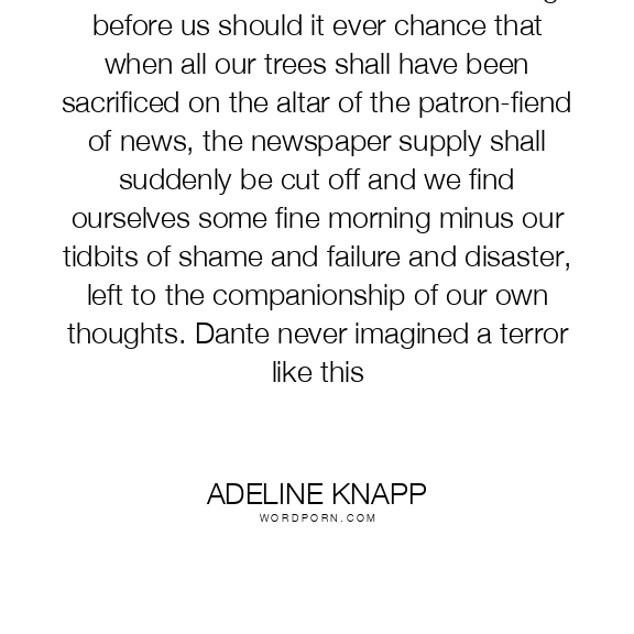 There is a fearful moment of reckoning before us should it ever chance that when all our trees shall have been sacrificed on the altar of the patron-fiend of news, the newspaper supply shall suddenly be cut off and we find ourselves some fine morning minus our tidbits of shame and failure and disaster, left to the companionship of our own thoughts. Dante never imagined a terror like this