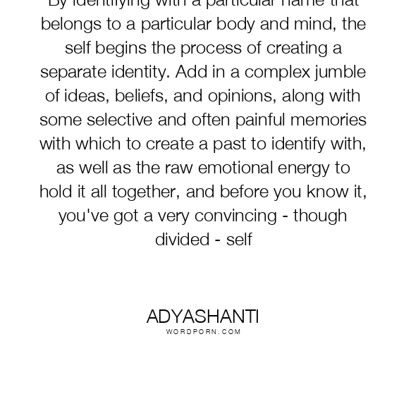 By identifying with a particular name that belongs to a particular body and mind, the self begins the process of creating a separate identity. Add in a complex jumble of ideas, beliefs, and opinions, along with some selective and often painful memories with which to create a past to identify with, as well as the raw emotional energy to hold it all together, and before you know it, you've got a very convincing - though divided - self