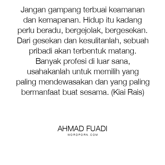 Jangan gampang terbuai keamanan dan kemapanan. Hidup itu kadang perlu beradu, bergejolak, bergesekan. Dari gesekan dan kesulitanlah, sebuah pribadi akan terbentuk matang. Banyak profesi di luar sana, usahakanlah untuk memilih yang paling mendewasakan dan yang paling bermanfaat buat sesama. (Kiai Rais)