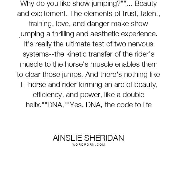 Why do you like show jumping?""... Beauty and excitement. The elements of trust, talent, training, love, and danger make show jumping a thrilling and aesthetic experience. It's really the ultimate test of two nervous systems--the kinetic transfer of the rider's muscle to the horse's muscle enables them to clear those jumps. And there's nothing like it--horse and rider forming an arc of beauty, efficiency, and power, like a double helix.""DNA,""Yes, DNA, the code to life