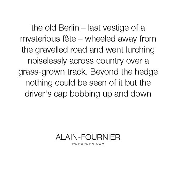 the old Berlin – last vestige of a mysterious fête – wheeled away from the gravelled road and went lurching noiselessly across country over a grass-grown track. Beyond the hedge nothing could be seen of it but the driver's cap bobbing up and down
