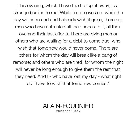 This evening, which I have tried to spirit away, is a strange burden to me. While time moves on, while the day will soon end and I already wish it gone, there are men who have entrusted all their hopes to it, all their love and their last efforts. There are dying men or others who are waiting for a debt to come due, who wish that tomorrow would never come. There are others for whom the day will break like a pang of remorse; and others who are tired, for whom the night will never be long enough to give them the rest that they need. And I - who have lost my day - what right do I have to wish that tomorrow comes?