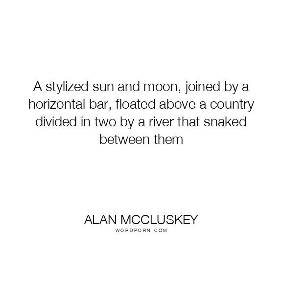 A stylized sun and moon, joined by a horizontal bar, floated above a country divided in two by a river that snaked between them