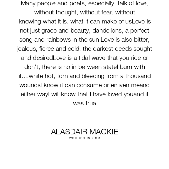 Many people and poets, especially, talk of love, without thought, without fear, without knowing,what it is, what it can make of usLove is not just grace and beauty, dandelions, a perfect song and rainbows in the sun Love is also bitter, jealous, fierce and cold, the darkest deeds sought and desiredLove is a tidal wave that you ride or don't, there is no in between stateI burn with it....white hot, torn and bleeding from a thousand woundsI know it can consume or enliven meand either wayI will know that I have loved youand it was true