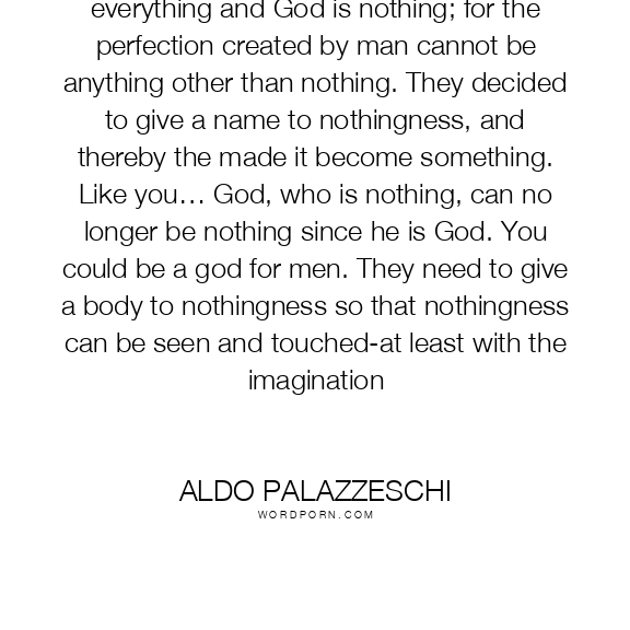 Don’t you know what god is? God is everything and God is nothing; for the perfection created by man cannot be anything other than nothing. They decided to give a name to nothingness, and thereby the made it become something. Like you… God, who is nothing, can no longer be nothing since he is God. You could be a god for men. They need to give a body to nothingness so that nothingness can be seen and touched-at least with the imagination