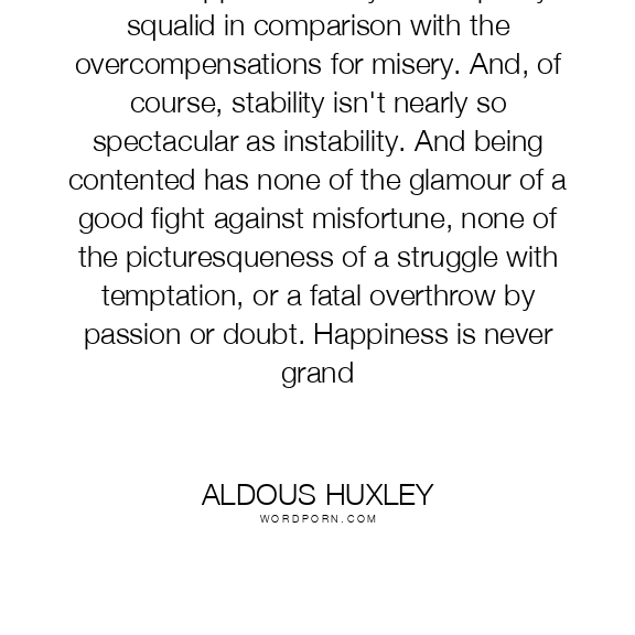 Actual happiness always looks pretty squalid in comparison with the overcompensations for misery. And, of course, stability isn't nearly so spectacular as instability. And being contented has none of the glamour of a good fight against misfortune, none of the picturesqueness of a struggle with temptation, or a fatal overthrow by passion or doubt. Happiness is never grand