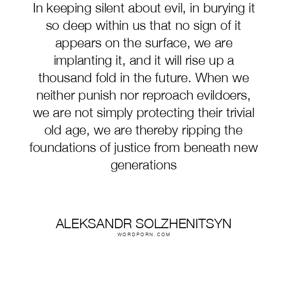 In keeping silent about evil, in burying it so deep within us that no sign of it appears on the surface, we are implanting it, and it will rise up a thousand fold in the future. When we neither punish nor reproach evildoers, we are not simply protecting their trivial old age, we are thereby ripping the foundations of justice from beneath new generations