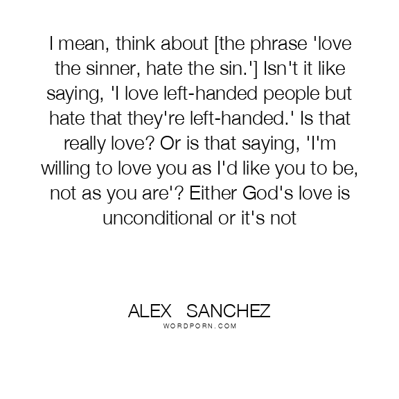 I mean, think about [the phrase 'love the sinner, hate the sin.'] Isn't it like saying, 'I love left-handed people but hate that they're left-handed.' Is that really love? Or is that saying, 'I'm willing to love you as I'd like you to be, not as you are'? Either God's love is unconditional or it's not