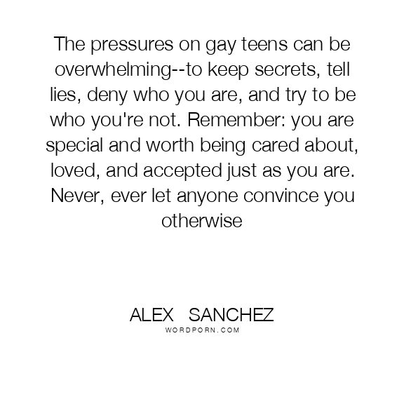The pressures on gay teens can be overwhelming--to keep secrets, tell lies, deny who you are, and try to be who you're not. Remember: you are special and worth being cared about, loved, and accepted just as you are. Never, ever let anyone convince you otherwise