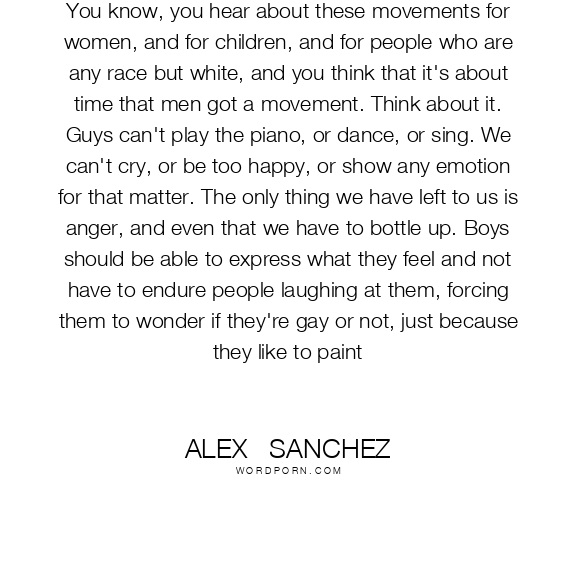 You know, you hear about these movements for women, and for children, and for people who are any race but white, and you think that it's about time that men got a movement. Think about it. Guys can't play the piano, or dance, or sing. We can't cry, or be too happy, or show any emotion for that matter. The only thing we have left to us is anger, and even that we have to bottle up. Boys should be able to express what they feel and not have to endure people laughing at them, forcing them to wonder if they're gay or not, just because they like to paint
