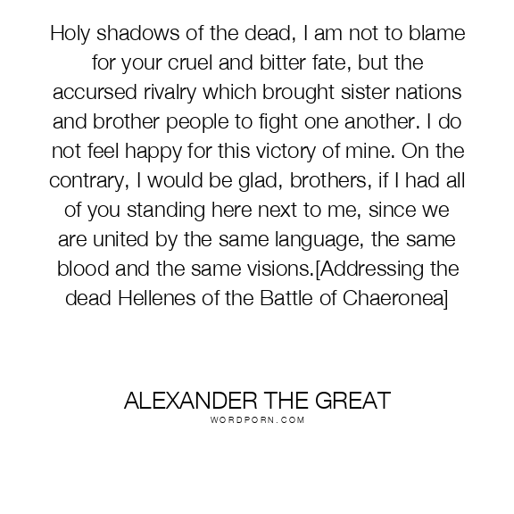 Holy shadows of the dead, I am not to blame for your cruel and bitter fate, but the accursed rivalry which brought sister nations and brother people to fight one another. I do not feel happy for this victory of mine. On the contrary, I would be glad, brothers, if I had all of you standing here next to me, since we are united by the same language, the same blood and the same visions.[Addressing the dead Hellenes of the Battle of Chaeronea]