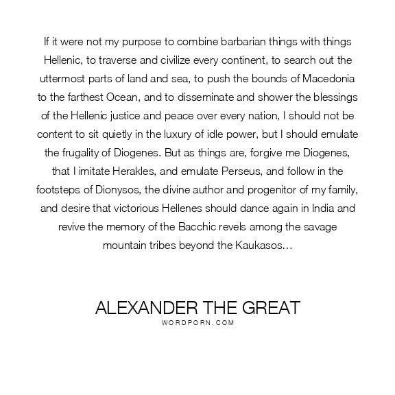 If it were not my purpose to combine barbarian things with things Hellenic, to traverse and civilize every continent, to search out the uttermost parts of land and sea, to push the bounds of Macedonia to the farthest Ocean, and to disseminate and shower the blessings of the Hellenic justice and peace over every nation, I should not be content to sit quietly in the luxury of idle power, but I should emulate the frugality of Diogenes. But as things are, forgive me Diogenes, that I imitate Herakles, and emulate Perseus, and follow in the footsteps of Dionysos, the divine author and progenitor of my family, and desire that victorious Hellenes should dance again in India and revive the memory of the Bacchic revels among the savage mountain tribes beyond the Kaukasos…