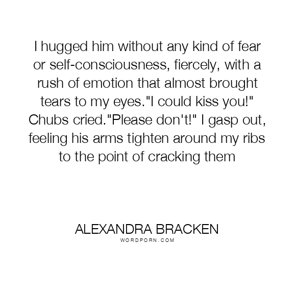 I hugged him without any kind of fear or self-consciousness, fiercely, with a rush of emotion that almost brought tears to my eyes."I could kiss you!" Chubs cried."Please don't!" I gasp out, feeling his arms tighten around my ribs to the point of cracking them