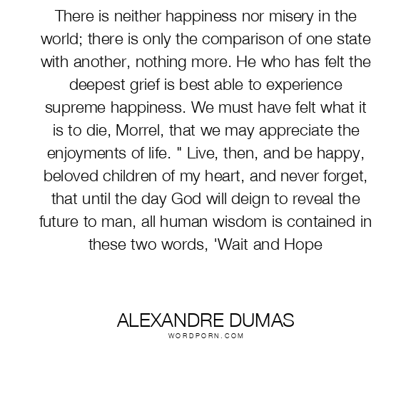 There is neither happiness nor misery in the world; there is only the comparison of one state with another, nothing more. He who has felt the deepest grief is best able to experience supreme happiness. We must have felt what it is to die, Morrel, that we may appreciate the enjoyments of life. " Live, then, and be happy, beloved children of my heart, and never forget, that until the day God will deign to reveal the future to man, all human wisdom is contained in these two words, 'Wait and Hope