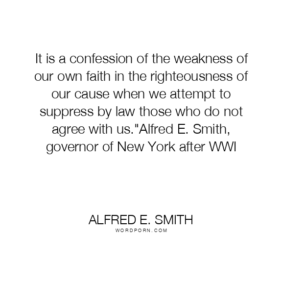 It is a confession of the weakness of our own faith in the righteousness of our cause when we attempt to suppress by law those who do not agree with us."Alfred E. Smith, governor of New York after WWI