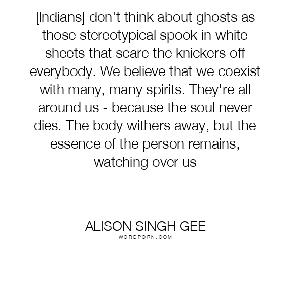 [Indians] don't think about ghosts as those stereotypical spook in white sheets that scare the knickers off everybody. We believe that we coexist with many, many spirits. They're all around us - because the soul never dies. The body withers away, but the essence of the person remains, watching over us