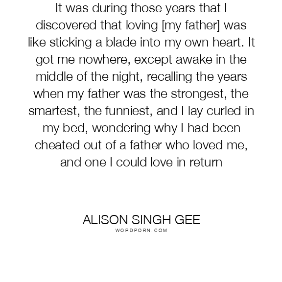 It was during those years that I discovered that loving [my father] was like sticking a blade into my own heart. It got me nowhere, except awake in the middle of the night, recalling the years when my father was the strongest, the smartest, the funniest, and I lay curled in my bed, wondering why I had been cheated out of a father who loved me, and one I could love in return