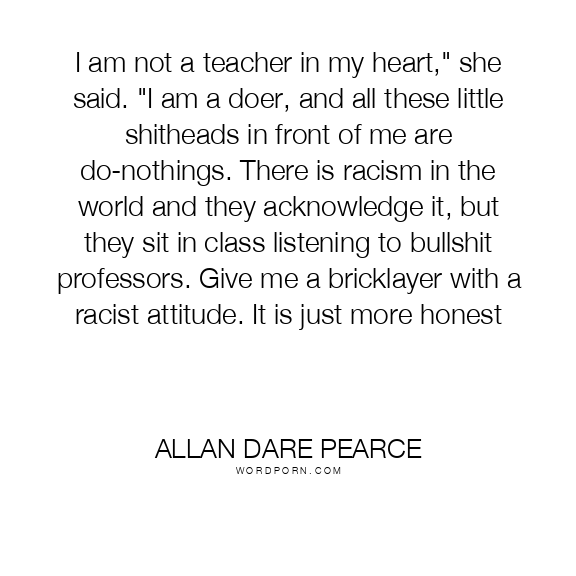 I am not a teacher in my heart," she said. "I am a doer, and all these little shitheads in front of me are do-nothings. There is racism in the world and they acknowledge it, but they sit in class listening to bullshit professors. Give me a bricklayer with a racist attitude. It is just more honest