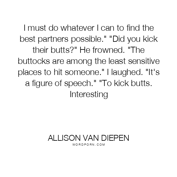 I must do whatever I can to find the best partners possible." "Did you kick their butts?" He frowned. "The buttocks are among the least sensitive places to hit someone." I laughed. "It's a figure of speech." "To kick butts. Interesting