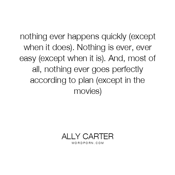 nothing ever happens quickly (except when it does). Nothing is ever, ever easy (except when it is). And, most of all, nothing ever goes perfectly according to plan (except in the movies)