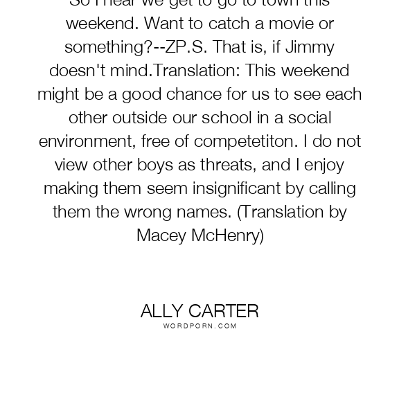 So I hear we get to go to town this weekend. Want to catch a movie or something?--ZP.S. That is, if Jimmy doesn't mind.Translation: This weekend might be a good chance for us to see each other outside our school in a social environment, free of competetiton. I do not view other boys as threats, and I enjoy making them seem insignificant by calling them the wrong names. (Translation by Macey McHenry)