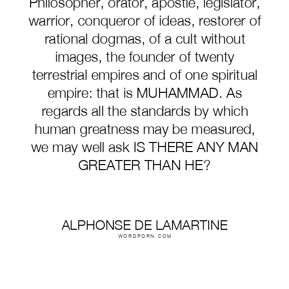 Philosopher, orator, apostle, legislator, warrior, conqueror of ideas, restorer of rational dogmas, of a cult without images, the founder of twenty terrestrial empires and of one spiritual empire: that is MUHAMMAD. As regards all the standards by which human greatness may be measured, we may well ask IS THERE ANY MAN GREATER THAN HE?
