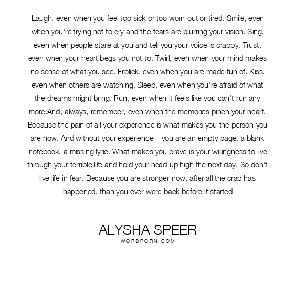 Laugh, even when you feel too sick or too worn out or tired. Smile, even when you're trying not to cry and the tears are blurring your vision. Sing, even when people stare at you and tell you your voice is crappy. Trust, even when your heart begs you not to. Twirl, even when your mind makes no sense of what you see. Frolick, even when you are made fun of. Kiss, even when others are watching. Sleep, even when you're afraid of what the dreams might bring. Run, even when it feels like you can't run any more.And, always, remember, even when the memories pinch your heart. Because the pain of all your experience is what makes you the person you are now. And without your experience---you are an empty page, a blank notebook, a missing lyric. What makes you brave is your willingness to live through your terrible life and hold your head up high the next day. So don't live life in fear. Because you are stronger now, after all the crap has happened, than you ever were back before it started