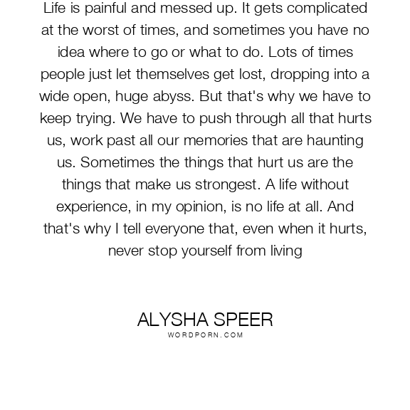 Life is painful and messed up. It gets complicated at the worst of times, and sometimes you have no idea where to go or what to do. Lots of times people just let themselves get lost, dropping into a wide open, huge abyss. But that's why we have to keep trying. We have to push through all that hurts us, work past all our memories that are haunting us. Sometimes the things that hurt us are the things that make us strongest. A life without experience, in my opinion, is no life at all. And that's why I tell everyone that, even when it hurts, never stop yourself from living