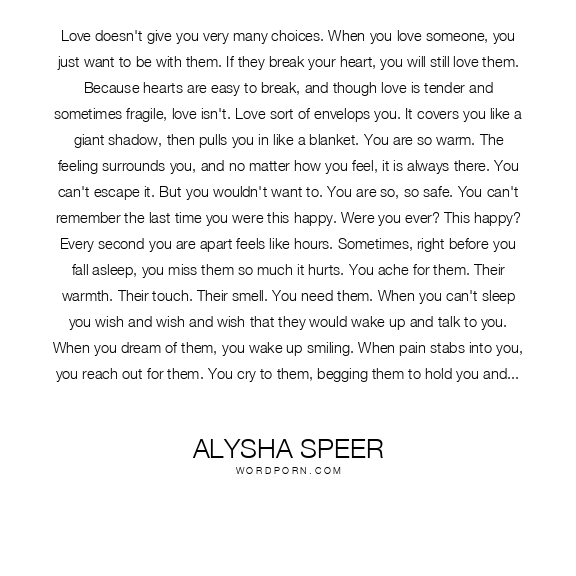 Love doesn't give you very many choices. When you love someone, you just want to be with them. If they break your heart, you will still love them. Because hearts are easy to break, and though love is tender and sometimes fragile, love isn't. Love sort of envelops you. It covers you like a giant shadow, then pulls you in like a blanket. You are so warm. The feeling surrounds you, and no matter how you feel, it is always there. You can't escape it. But you wouldn't want to. You are so, so safe. You can't remember the last time you were this happy. Were you ever? This happy? Every second you are apart feels like hours. Sometimes, right before you fall asleep, you miss them so much it hurts. You ache for them. Their warmth. Their touch. Their smell. You need them. When you can't sleep you wish and wish and wish that they would wake up and talk to you. When you dream of them, you wake up smiling. When pain stabs into you, you reach out for them. You cry to them, begging them to hold you and make it all go away, make everything go away. Love addicts you to its feeling. You never, ever want to lose that feeling. Sometimes the fear of losing love drives people to do crazy things. Like buy a plane ticket. Make a phone call. Run out of a class. Cry. Write. Laugh.Because when you love someone, you really love them. You give them your whole heart. You trust them. You never want to be away from them. Sometimes, you don't even need their words. You just need them there.Love is such an amazing thing, and too many people take it for granted. If you're in love, don't let it go. Don't you dare let it go