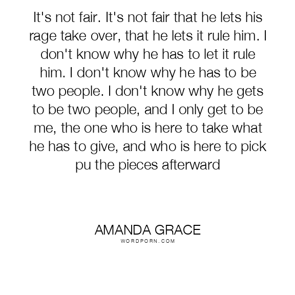 It's not fair. It's not fair that he lets his rage take over, that he lets it rule him. I don't know why he has to let it rule him. I don't know why he has to be two people. I don't know why he gets to be two people, and I only get to be me, the one who is here to take what he has to give, and who is here to pick pu the pieces afterward