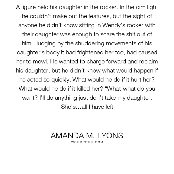 A figure held his daughter in the rocker. In the dim light he couldn’t make out the features, but the sight of anyone he didn’t know sitting in Wendy’s rocker with their daughter was enough to scare the shit out of him. Judging by the shuddering movements of his daughter’s body it had frightened her too, had caused her to mewl. He wanted to charge forward and reclaim his daughter, but he didn’t know what would happen if he acted so quickly. What would he do if it hurt her? What would he do if it killed her? “What-what do you want? I’ll do anything just don’t take my daughter. She’s…all I have left