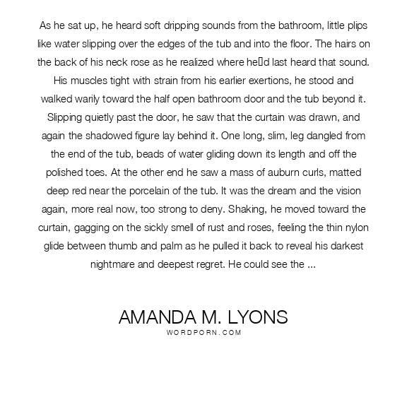 As he sat up, he heard soft dripping sounds from the bathroom, little plips like water slipping over the edges of the tub and into the floor. The hairs on the back of his neck rose as he realized where he‟d last heard that sound. His muscles tight with strain from his earlier exertions, he stood and walked warily toward the half open bathroom door and the tub beyond it. Slipping quietly past the door, he saw that the curtain was drawn, and again the shadowed figure lay behind it. One long, slim, leg dangled from the end of the tub, beads of water gliding down its length and off the polished toes. At the other end he saw a mass of auburn curls, matted deep red near the porcelain of the tub. It was the dream and the vision again, more real now, too strong to deny. Shaking, he moved toward the curtain, gagging on the sickly smell of rust and roses, feeling the thin nylon glide between thumb and palm as he pulled it back to reveal his darkest nightmare and deepest regret. He could see the crimson water now, blood bubbles gliding over its surface and clinging to the legs dangling over the tub‟s edge. When he‟d pulled the curtain completely away from the tub and around to its opposite side, he saw her face. Her eyes were closed and he saw that her lids were bruised and purple against the translucent paleness of her face, drained completely dead white under the makeup she‟d brushed on before she‟d died. Staggering by the sight of her, he knelt by the tub and extended one shaking hand to touch her cheek. It all seemed as if he‟d walked into a horror film and once again he needed to prove to his mind that this wasn‟t real. His hand shook as he lifted it nearer to her flesh, waiting for the corpse, the supposedly dead and buried to move. He touched his quivering fingers to her face, feeling its claylike reality. The sensation caused an immediate shudder of revulsion and he fought not to vomit. Even as the moment came, the sight of her moving in the water startled him and he jumped away from the tub. It wasn‟t an obvious movement at first, only soft breaths moving in and out of her nostrils, but then her chest rose and fell with it and he quaked, feeling unstable where he knelt on the floor.Her eyes opened next and he felt the blood fall out of his face, wanting to scream but too afraid he would cause her to take some action, to reach out and touch him, proving well and forever that he was indeed insane. Scream and you might as well slit your own throat. He swallowed the scream like a rock and stared as her eyes moved slowly in their sockets, locking on him. Slowly, as if she‟d lost control of her muscles, she rose from the tub and looked down at him, smiling. Blood water slid down her bare body, over her neck, down her back and the smooth ridges of her breasts, to slip slowly down her thighs and down over her calves. A puddle spread on the floor, and as it extended toward him he struggled to his feet, skittering away from it. As he watched it spread, he shivered, weak as he started to cry frantic, horrified tears. Breaking down, he looked back up at her face and slipped to the floor once more, his knees incapable of sustaining his own weight. The smile grew wider as she strode to his shivering form, thrown on his side and struggling to rise. The blood water seeped into his clothes, making him sick, a drop of it trickling along the lobe of his ear and into it. And then she leaned down, holding those dim, stained curls of auburn out of her face and tucking them behind her ear. Her lips parted, blue beneath the strong crimson red of her lipstick, and she spoke into his ear with the chill breath of the dead. His eyes grew wide and horrified as she spoke, the hair on his neck rising, sending a maddening shiver of fear through him. “I‟ve returned, Raven