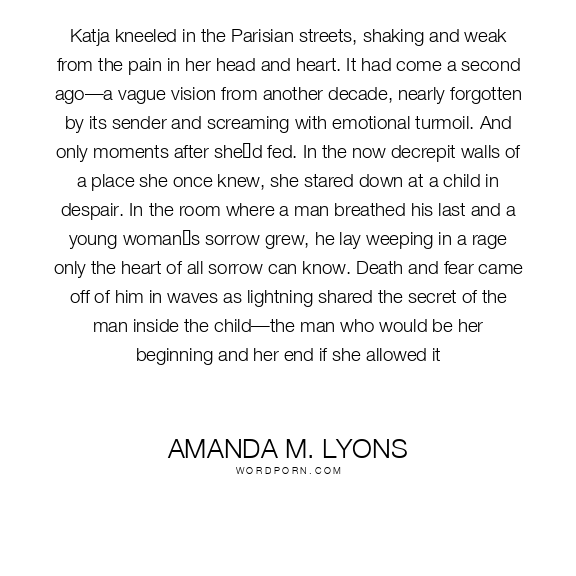 Katja kneeled in the Parisian streets, shaking and weak from the pain in her head and heart. It had come a second ago—a vague vision from another decade, nearly forgotten by its sender and screaming with emotional turmoil. And only moments after she‟d fed. In the now decrepit walls of a place she once knew, she stared down at a child in despair. In the room where a man breathed his last and a young woman‟s sorrow grew, he lay weeping in a rage only the heart of all sorrow can know. Death and fear came off of him in waves as lightning shared the secret of the man inside the child—the man who would be her beginning and her end if she allowed it