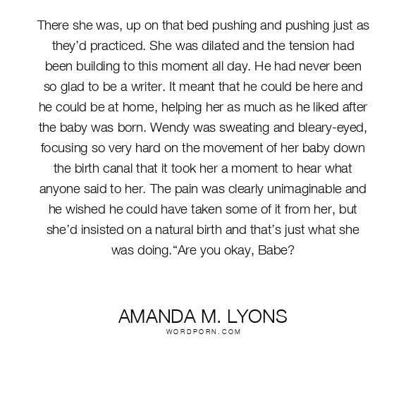 There she was, up on that bed pushing and pushing just as they’d practiced. She was dilated and the tension had been building to this moment all day. He had never been so glad to be a writer. It meant that he could be here and he could be at home, helping her as much as he liked after the baby was born. Wendy was sweating and bleary-eyed, focusing so very hard on the movement of her baby down the birth canal that it took her a moment to hear what anyone said to her. The pain was clearly unimaginable and he wished he could have taken some of it from her, but she’d insisted on a natural birth and that’s just what she was doing.“Are you okay, Babe?