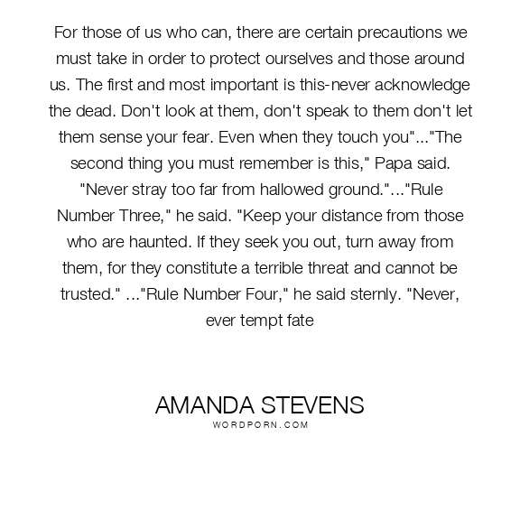 Amanda Stevens quote. For those of us who can, there are certain precautions we must take in order to protect ourselves and those around us. The first and most important is this-never acknowledge the dead. Don't look at them, don't speak to them don't let them sense your fear. Even when they touch you