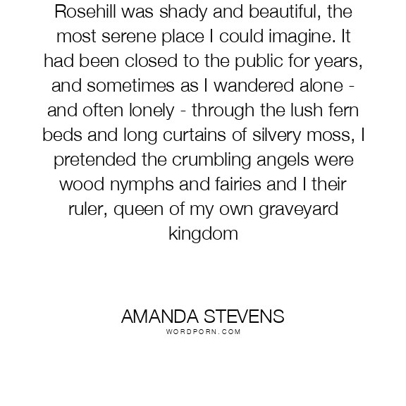 Amanda Stevens quote. Rosehill was shady and beautiful, the most serene place I could imagine. It had been closed to the public for years, and sometimes as I wandered alone - and often lonely - through the lush fern beds and long curtains of silvery moss, I pretended the crumbling angels were wood nymphs and fairies and I their ruler, queen of my own graveyard kingdom