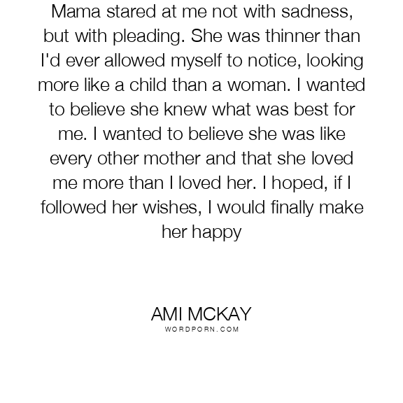 Mama stared at me not with sadness, but with pleading. She was thinner than I'd ever allowed myself to notice, looking more like a child than a woman. I wanted to believe she knew what was best for me. I wanted to believe she was like every other mother and that she loved me more than I loved her. I hoped, if I followed her wishes, I would finally make her happy