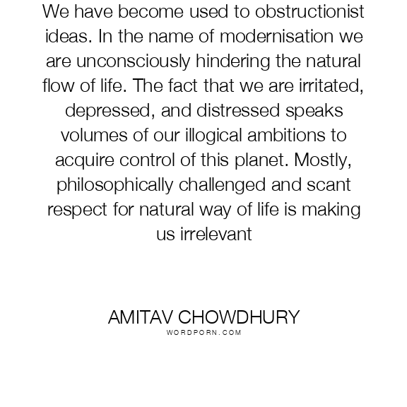 We have become used to obstructionist ideas. In the name of modernisation we are unconsciously hindering the natural flow of life. The fact that we are irritated, depressed, and distressed speaks volumes of our illogical ambitions to acquire control of this planet. Mostly, philosophically challenged and scant respect for natural way of life is making us irrelevant