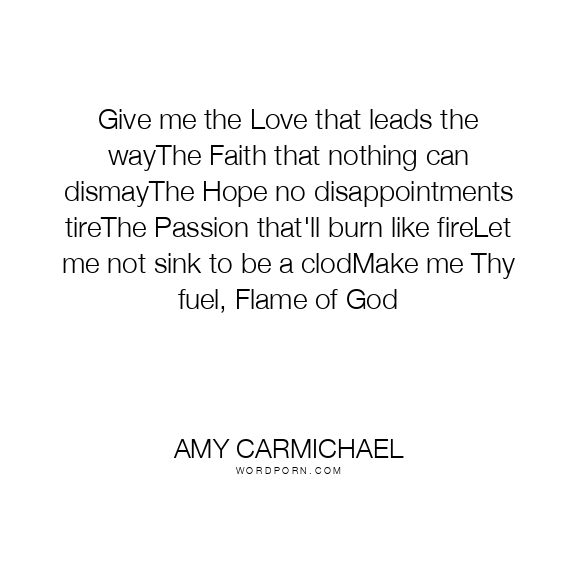 Give me the Love that leads the wayThe Faith that nothing can dismayThe Hope no disappointments tireThe Passion that'll burn like fireLet me not sink to be a clodMake me Thy fuel, Flame of God
