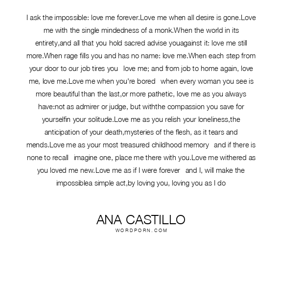I ask the impossible: love me forever.Love me when all desire is gone.Love me with the single mindedness of a monk.When the world in its entirety,and all that you hold sacred advise youagainst it: love me still more.When rage fills you and has no name: love me.When each step from your door to our job tires you--love me; and from job to home again, love me, love me.Love me when you're bored--when every woman you see is more beautiful than the last,or more pathetic, love me as you always have:not as admirer or judge, but withthe compassion you save for yourselfin your solitude.Love me as you relish your loneliness,the anticipation of your death,mysteries of the flesh, as it tears and mends.Love me as your most treasured childhood memory--and if there is none to recall--imagine one, place me there with you.Love me withered as you loved me new.Love me as if I were forever--and I, will make the impossiblea simple act,by loving you, loving you as I do