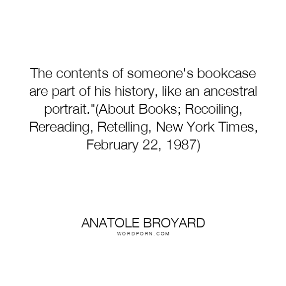 The contents of someone's bookcase are part of his history, like an ancestral portrait."(About Books; Recoiling, Rereading, Retelling, New York Times, February 22, 1987)